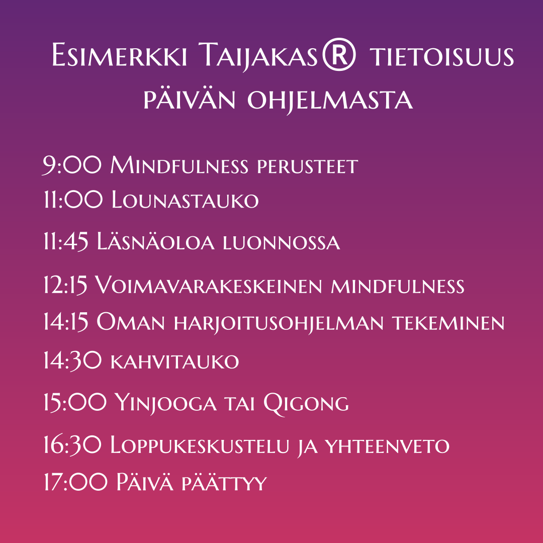 Taijakas® tietoisuus -päivän aikana opit hyväksyvän tietoisen läsnäolon perustaidot, joilla tuet hyvinvointiasi, vähennät stressiä ja löydät rauhan arjen kaaoksessa.